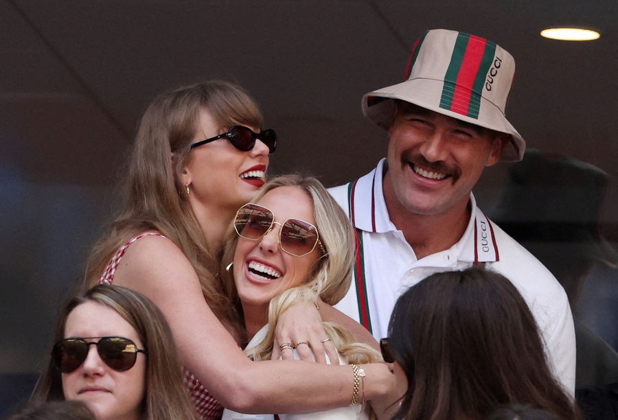 Tennis – U.S. Open – Flushing Meadows, New York, United States – September 8, 2024 Singer Taylor Swift embraces Brittany Mahomes, next to Kansas City Chiefs’ Travis Kelce during the final match between Italy’s Jannik Sinner and Taylor Fritz of the U.S. REUTERS/Mike Segar