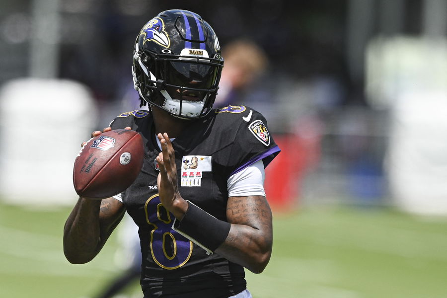 Jul 27, 2024; Owings Mill , MD, USA; Ravens quarterback Lamar Jackson (8) looks up field to throw during the afternoon session of training camp at the Under Armour Performance Center, Mandatory Credit: Tommy Gilligan-USA TODAY Sports