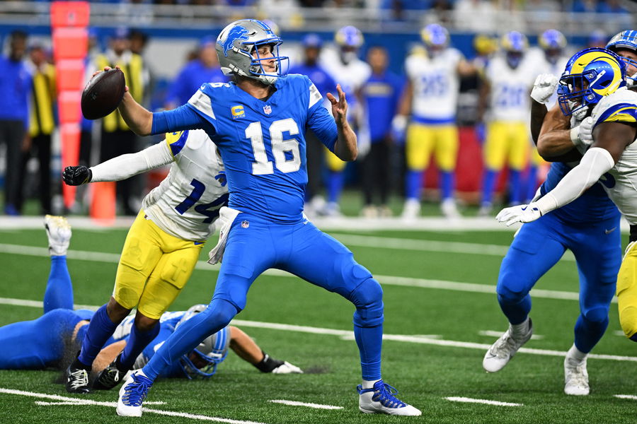 Sep 8, 2024; Detroit, Michigan, USA; Detroit Lions quarterback Jared Goff (16) throws a pass against the Los Angeles Rams in the fourth quarter at Ford Field. Mandatory Credit: Lon Horwedel-Imagn Images