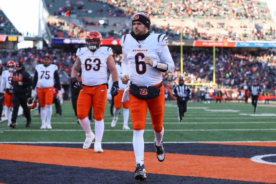 CINCINNATI, OH – DECEMBER 14: Cincinnati Bengals quarterback Jake Browning 6 jogs off the field at halftime during the game against the Baltimore Ravens and the Cincinnati Bengals on December 14, 2025, at Paycor Stadium in Cincinnati, OH. Photo by Ian Johnson/Icon Sportswire NFL, American Football Herren, USA DEC 14 Ravens at Bengals EDITORIAL USE ONLY Icon251214037