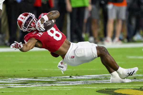 MIAMI GARDENS, FL – JANUARY 19: RB Kaelon Black 8 of the Indiana Hoosiers falls backwards after running with the ball during the Indiana Hoosiers versus the Miami Hurricanes College Football Playoff National Championship Game Presented by AT&T on January 19, 2026, at Hard Rock Stadium in Miami Gardens, FL. Photo by Doug Murray/Icon Sportswire COLLEGE FOOTBALL: JAN 19 College Football Playoff National Championship Presented by AT&T Indiana vs Miami EDITORIAL USE ONLY Icon796260119131