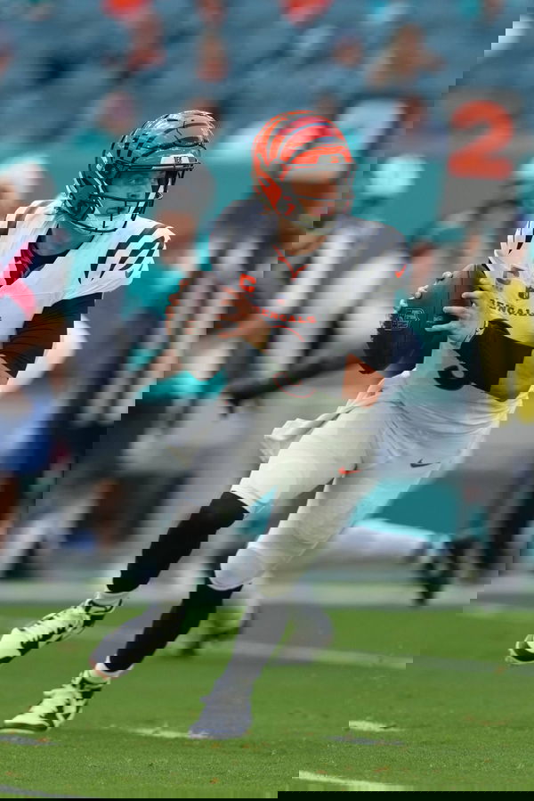 MIAMI GARDENS, FL – DECEMBER 21: Cincinnati Bengals quarterback Joe Burrow 9 rolls out from the pocket during the game between the Cincinnati Bengals and the Miami Dolphins on Sunday, December 21, 2025 at Hard Rock Stadium in Miami Gardens, FL Photo by Peter Joneleit/Icon Sportswire NFL, American Football Herren, USA DEC 21 Bengals at Dolphins EDITORIAL USE ONLY Icon251221040
