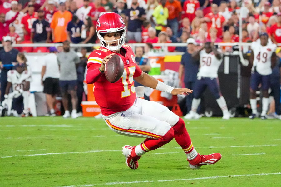 Aug 22, 2025; Kansas City, Missouri, USA; Kansas City Chiefs quarterback Patrick Mahomes (15) runs for a first down against the Chicago Bears during the first half of the game at GEHA Field at Arrowhead Stadium. Mandatory Credit: Denny Medley-Imagn Images