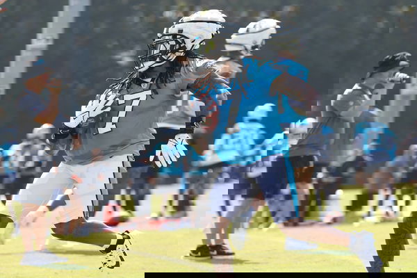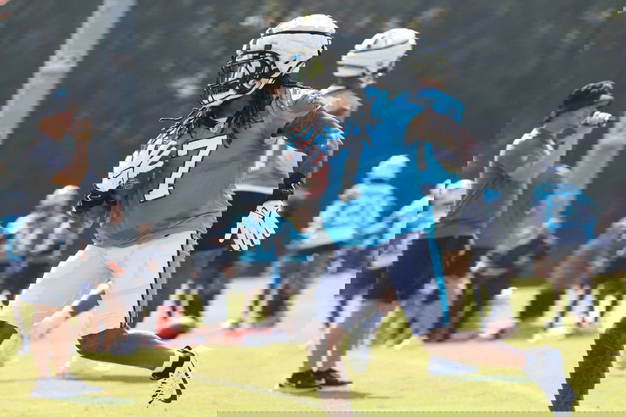 SPARTANBURG, SC – JULY 27: Carolina Panthers linebacker Shaq Thompson 7 runs a drill during the NFL, American Football Herren, USA Carolina Panthers training camp on July 27, 2023, at Wofford College campus in Spartanburg, S.C. Photo by John Byrum/Icon Sportswire NFL: JUL 27 Carolina Panthers Training Camp EDITORIAL USE ONLY Icon23072737