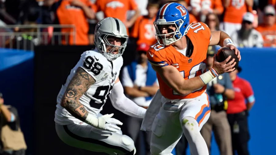 Bo Nix (10) of the Denver Broncos scrambles under pressure from Maxx Crosby (98) of the Las Vegas Raiders for a one yard gain during the third quarter at Empower Field at Mile High in Denver on Sunday, Oct. 6, 2024. The Denver Broncos took on the Las Vegas Raiders. (Photo by Eric Lutzens/The Denver Post)