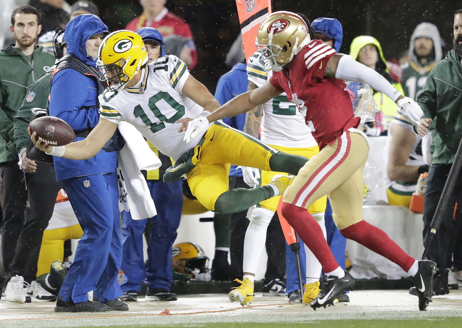 Jan 20, 2024; Santa Clara, CA, USA; Green Bay Packers quarterback Jordan Love (10) is knocked out of bounds by San Francisco 49ers cornerback Deommodore Lenoir (2) in a 2024 NFC divisional round game at Levi’s Stadium. Mandatory Credit: Dan Powers-USA TODAY Sports