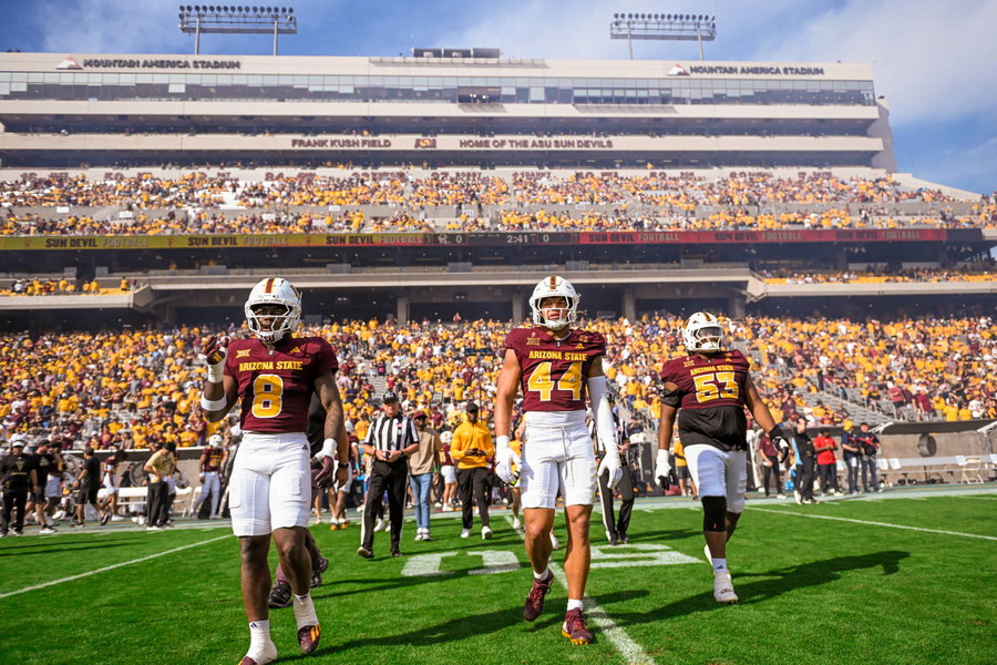 NCAA, College League, USA Football: ASU vs West Virginia Arizona State Sun Devils linebacker Jordan Crook 8, linebacker Keyshaun Elliott 44, and offensive lineman Joshua Atkins 53 walk out to the coin flip before an NCAA football game between the Arizona State Sun Devils and the West Virginia Mountaineers in Tempe, Arizona, Saturday, November 15, 2025. Arizona State defeated West Virginia 25-23 Thomas Fernandez/Image of . Tempe Arizona United States EDITORIAL USE ONLY Copyright: xThomasxFernandezxPhotographyx ThomasxFernandezx iosphotos385788