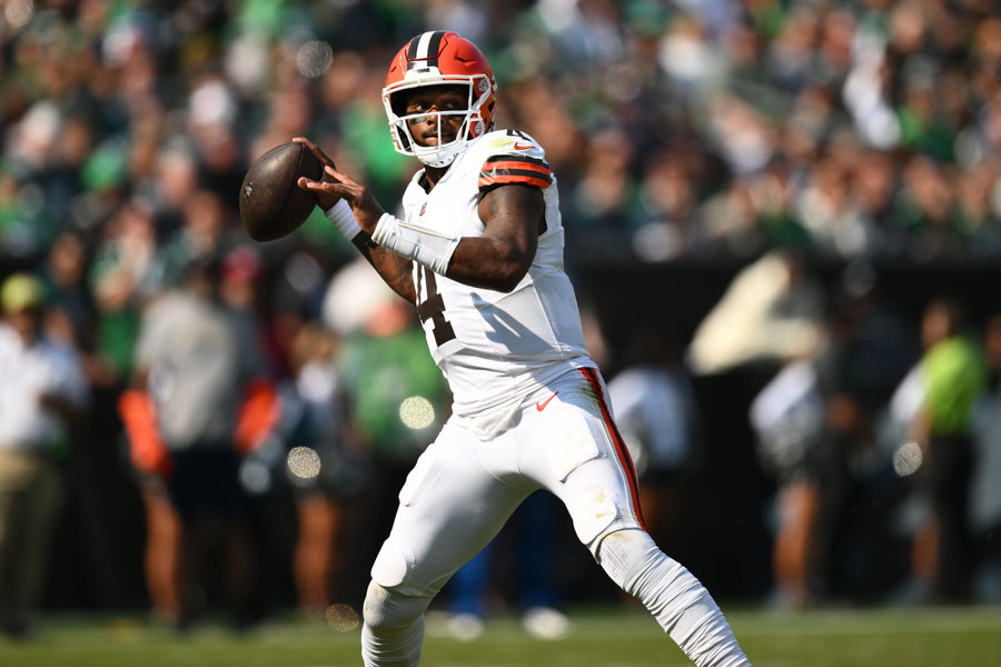 PHILADELPHIA, PA – OCTOBER 13: Cleveland Browns quarterback DeShaun Watson 4 throws a pass in the second quarter during the game between the Cleveland Browns and Philadelphia Eagles on October 13, 20,24 at Lincoln Financial Field in Philadelphia, PA. Photo by Kyle Ross/Icon Sportswire NFL, American Football Herren, USA OCT 13 Browns at Eagles EDITORIAL USE ONLY Icon24101309