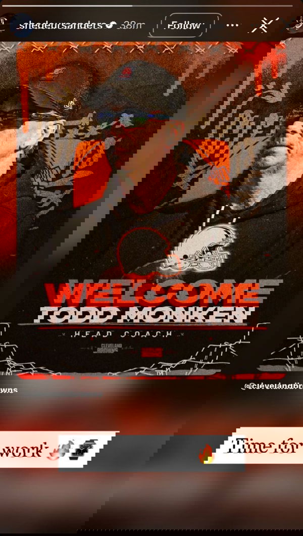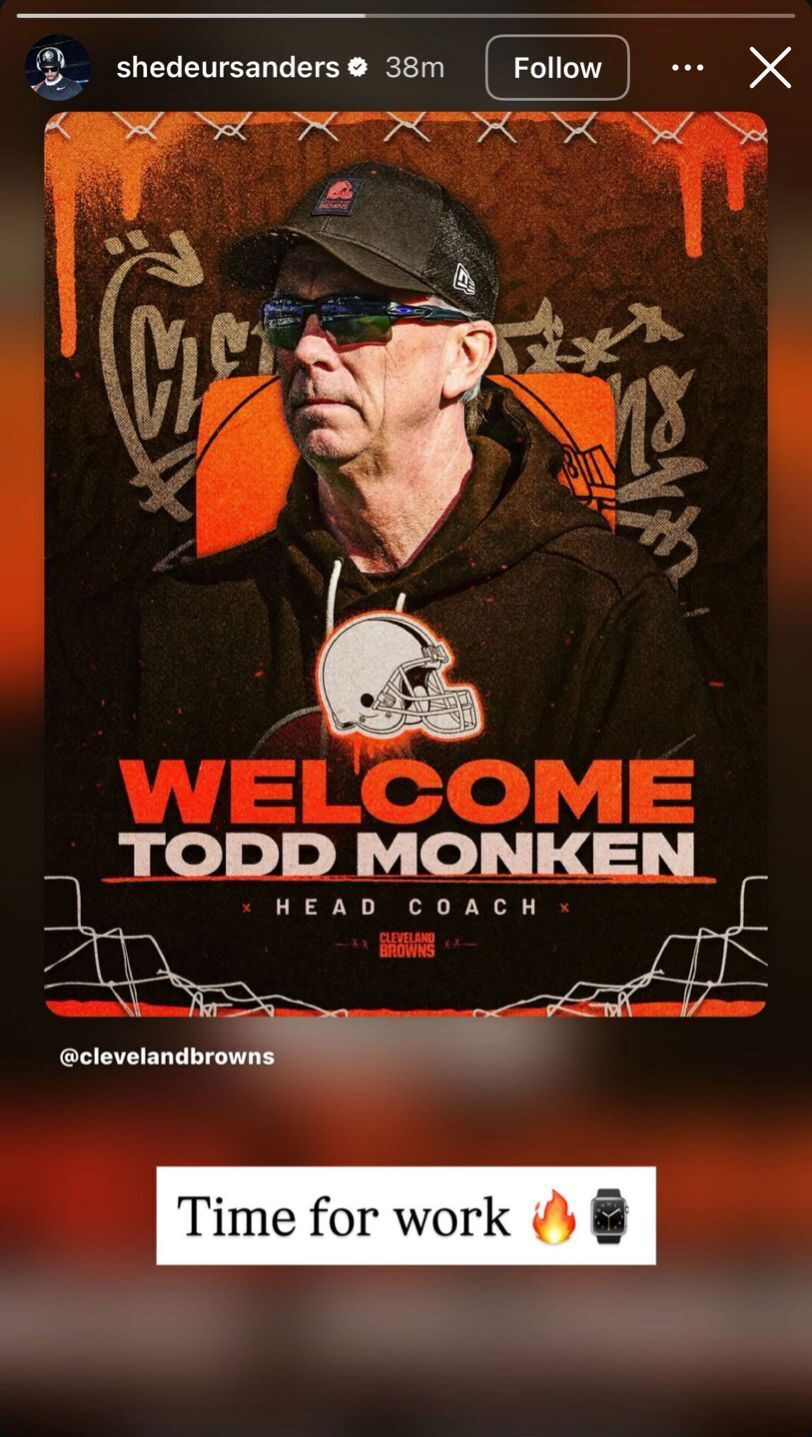 The Browns announced the hire on Instagram on Wednesday, welcoming Todd Monken back to Cleveland as the franchise’s new head coach. Shedeur Sanders later reposted the announcement on his IG story, adding a three-word message for Browns’ new HC: “Time for work” with fire and watch emojis in the story caption. The caption made it clear Sanders is focused and prepared to move forward under Monken as head coach.
