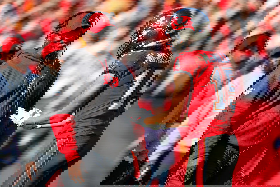 January 5, 2025, Tampa, Florida, USA: Tampa Bay Buccaneers head coach Todd Bowles and wide receiver Jalen McMillan 15 chat with each other, after McMillian was called for a penalty, while the New Orleans Saints wait for the next play during the fourth quarter at Raymond James Stadium in Tampa on Sunday, Jan. 5, 2025. Tampa USA – ZUMAs70_ 0791703892st Copyright: xJeffereexWoox