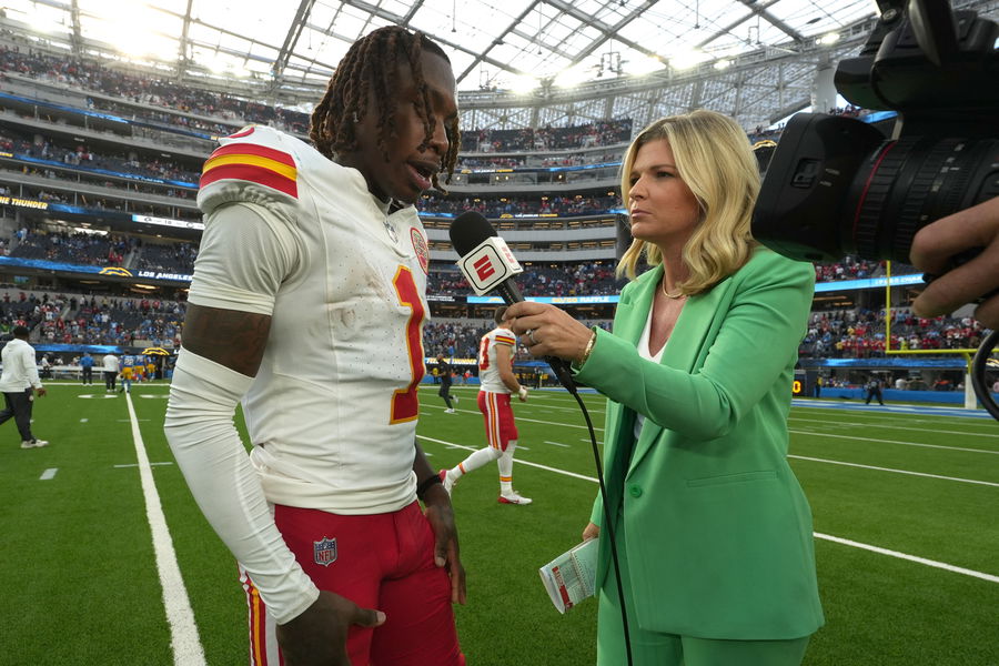 Sep 29, 2024; Inglewood, California, USA; ESPN reporter Lindsey Thiry interviews Kansas City Chiefs wide receiver Xavier Worthy (1) after the game against the Los Angeles Chargers at SoFi Stadium. Mandatory Credit: Kirby Lee-Imagn Images