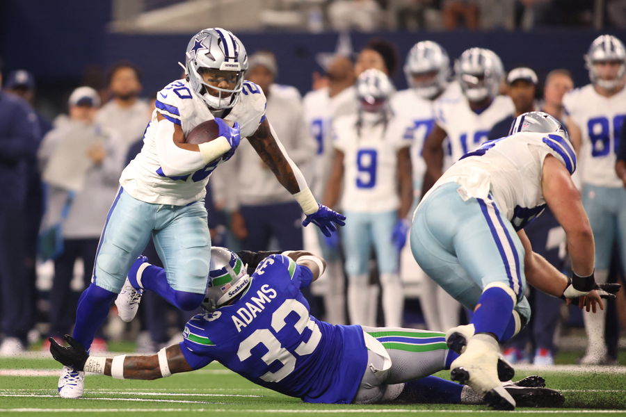 Nov 30, 2023; Arlington, Texas, USA; Seattle Seahawks safety Jamal Adams (33) attempts to tackle Dallas Cowboys running back Tony Pollard (20) during the first half at AT&T Stadium. Mandatory Credit: Tim Heitman-USA TODAY Sports
