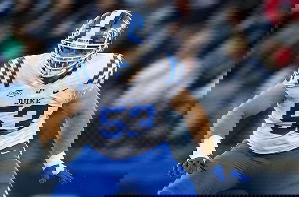 NCAA, College League, USA Football 2025: Duke Vs UConn NOV 8 November 8, 2025: Duke Blue Devils offensive lineman Brian Parker II 53 looks to block during an NCAA football game against the UConn Huskies Saturday, Nov. 8, 2025, in East Hartford, CT. Rusty Jones/Cal Media Credit Image: Rusty Jones/Cal Sport Media East Hartford Ct USA EDITORIAL USE ONLY Copyright: xx ZUMA-20251108_zma_c04_792.jpg RustyxJonesx csmphotothree440896
