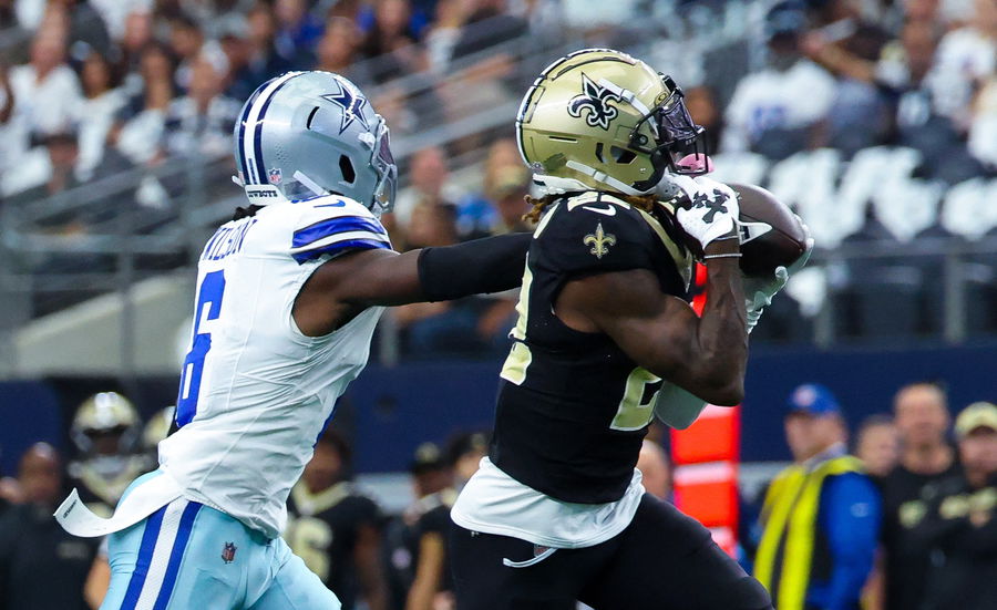 Sep 15, 2024; Arlington, Texas, USA; New Orleans Saints wide receiver Rashid Shaheed (22) catches a touchdown pass past Dallas Cowboys safety Donovan Wilson (6) during the first quarter at AT&T Stadium. Mandatory Credit: Kevin Jairaj-Imagn Images