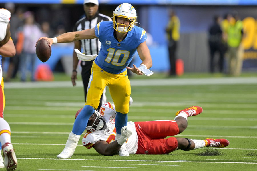 Sep 29, 2024; Inglewood, California, USA; Los Angeles Chargers quarterback Justin Herbert (10) breaks loose from the grip of Kansas City Chiefs defensive end Felix Anudike-Uzomah (97) in the second half at SoFi Stadium. Mandatory Credit: Jayne Kamin-Oncea-Imagn Images
