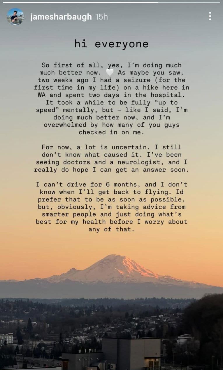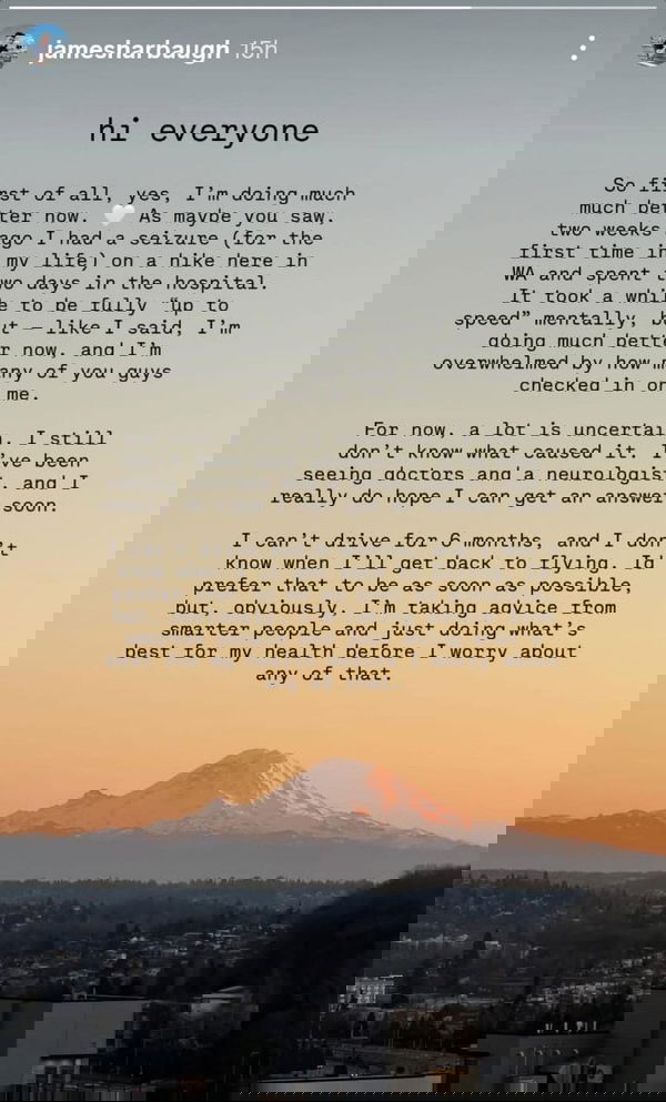 “So, first of all, yes, I’m doing much better now,” posted James Harbaugh on his Instagram story, updating his followers. “As maybe you saw, two weeks ago I had a seizure (for the first time in my life) on a hike here in WA and spent two days in the hospital. It took a while to be fully ‘up to speed’ mentally, but – like I said, I’m doing much better now, and I’m overwhelmed by how many of you guys checked in on me.”