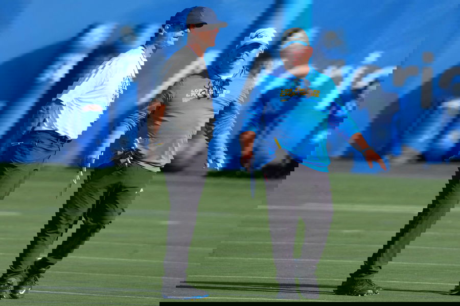 NFL, American Football Herren, USA Los Angeles Chargers Training Camp aJul 25, 2025 El Segundo, CA, USA Los Angeles Chargers coach Jim Harbaugh left and offensive coordinator Greg Roman during training camp at The Bolt. El Segundo The Bolt California United States, EDITORIAL USE ONLY PUBLICATIONxINxGERxSUIxAUTxONLY Copyright: xKirbyxLeex 20250725_jhp_al2_0343