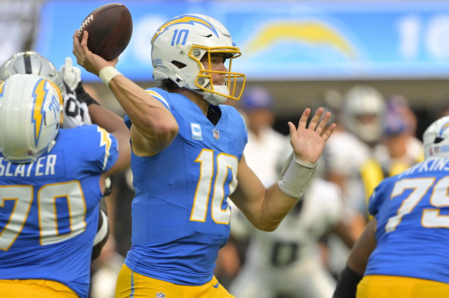 Sep 8, 2024; Inglewood, California, USA; Los Angeles Chargers quarterback Justin Herbert (10) throws the ball against the Las Vegas Raiders in the second half at SoFi Stadium. Mandatory Credit: Kirby Lee-Imagn Images