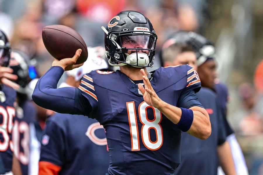 Aug 17, 2024; Chicago, Illinois, USA; Chicago Bears quarterback Caleb Williams (18) warms up before the game against the Cincinnati Bengals at Soldier Field. Mandatory Credit: Daniel Bartel-USA TODAY Sports