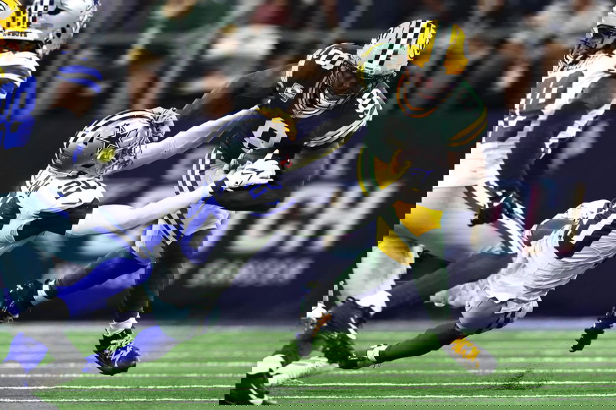 NFL, American Football Herren, USA Green Bay Packers at Dallas Cowboys Sep 28, 2025 Arlington, Texas, USA Green Bay Packers running back Josh Jacobs 8 runs against Dallas Cowboys cornerback Kaiir Elam 20 in the first quarter at AT&T Stadium. Arlington AT&T Stadium Texas USA, EDITORIAL USE ONLY PUBLICATIONxINxGERxSUIxAUTxONLY Copyright: xKevinxJairajx 20250928_lbm_aj6_033