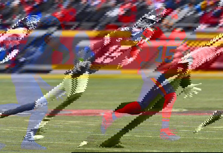 Tennessee Titans vs. Kansas City Chiefs Kansas City Chiefs quarterback Patrick Mahomes takes off on a 27-yard touchdown run late in the second quarter against the Tennessee Titans during the AFC championship game on Sunday, Jan. 19, 2020, at Arrowhead Stadium in Kansas City, Mo. Rich Sugg/Kansas City Star/TNS KANSAS CITY MO USA EDITORIAL USE ONLY Copyright: xx 1546756 RichxSuggx krtphotoslive880091