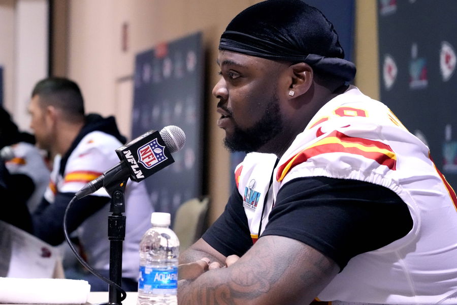 NFL, American Football Herren, USA Super Bowl LVII-Kansas City Chiefs press conference, PK, Pressekonferenz Feb 8, 2023 Scottsdale, AZ, USA Kansas City Chiefs defensive tackle Khalen Saunders 99 answers questions from the media during team availability at Hyatt Regency at Gainey Ranch. Scottsdale Hyatt Regency at Gainey Ranch AZ USA, EDITORIAL USE ONLY PUBLICATIONxINxGERxSUIxAUTxONLY Copyright: xCherylxEvansx 20230204_anw_kp9_112