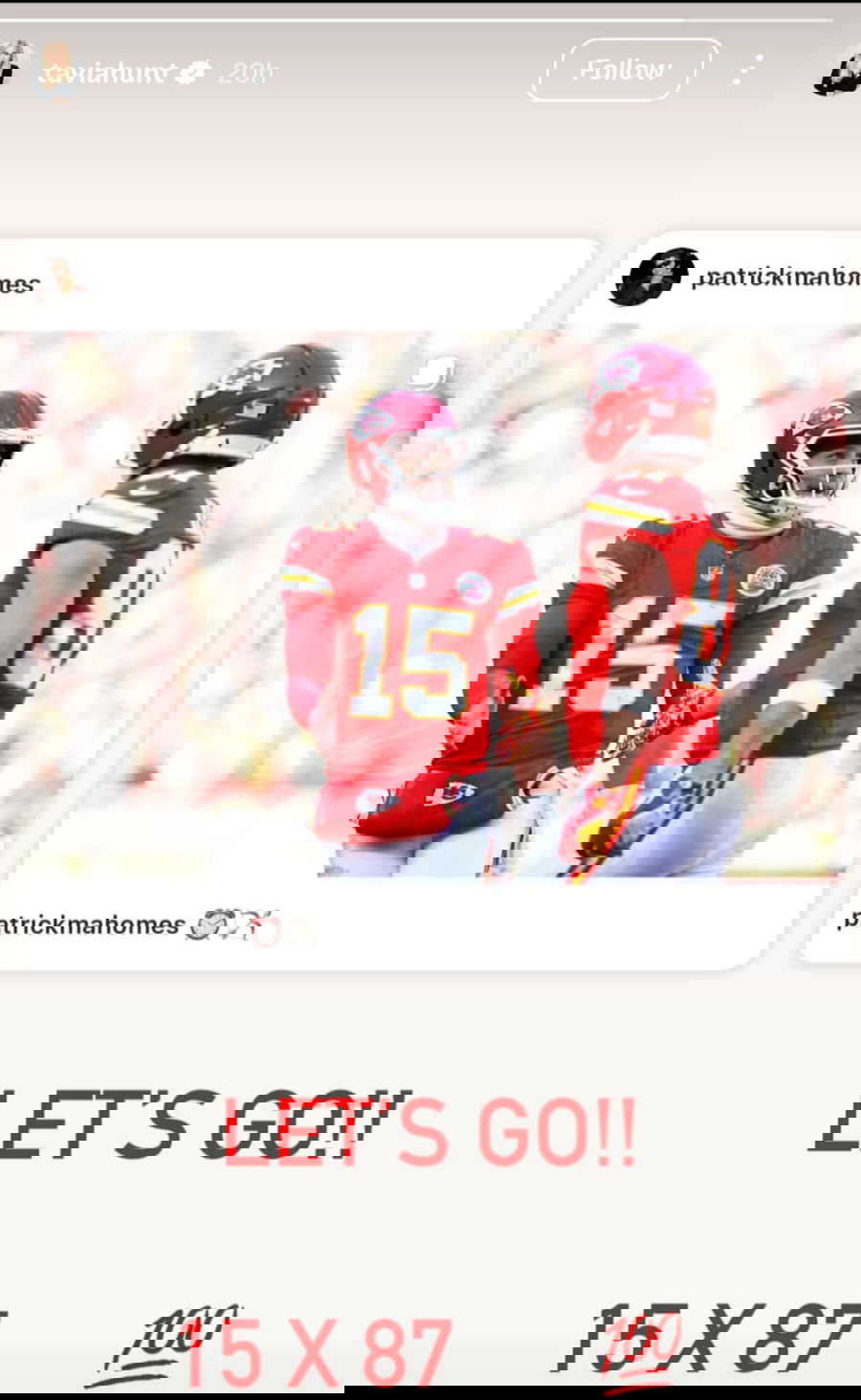 “LET’S GO!!,” wrote Tavia Hunt on her Instagram story, sharing a picture of Patrick Mahomes and Travis Kelce while mentioning their respective jersey numbers.