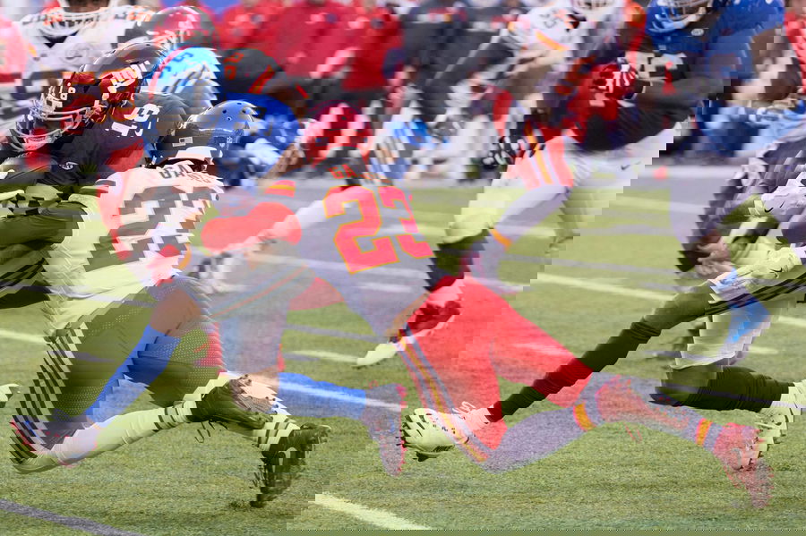 KANSAS CITY, MO – NOVEMBER 01: Kansas City Chiefs wide receiver Demarcus Robinson 11 stiff arms a tackler against the New York Giants on November 1st, 2021 at GEHA field at Arrowhead Stadium in Kansas City, Missouri. Photo by William Purnell/Icon Sportswire NFL, American Football Herren, USA NOV 01 Giants at Chiefs Icon2111010743