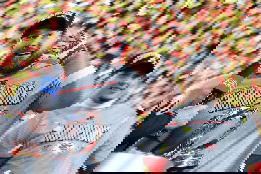 NFL, American Football Herren, USA AFC Championship-Buffalo Bills at Kansas City Chiefs Jan 26, 2025 Kansas City, MO, USA Kansas City Chiefs tight end Travis Kelce 87 reacts on stage after the AFC Championship game against the Buffalo Bills at GEHA Field at Arrowhead Stadium. Kansas City GEHA Field at Arrowhead Stadium MO USA, EDITORIAL USE ONLY PUBLICATIONxINxGERxSUIxAUTxONLY Copyright: xMarkxJ.xRebilasx 20250126_mcd_su5_228