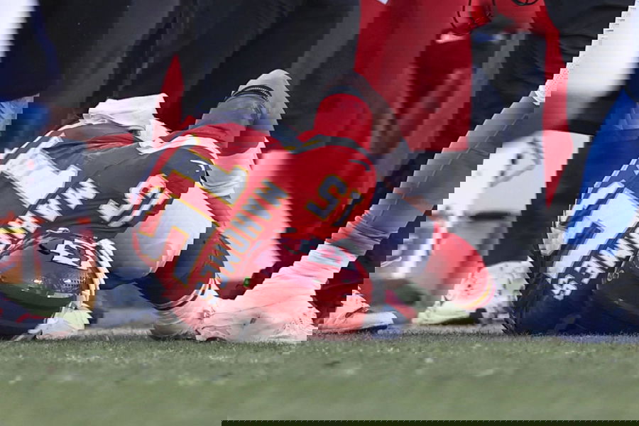 KANSAS CITY, MO – DECEMBER 14: Kansas City Chiefs quarterback Patrick Mahomes 15 lies on the ground holding his knee after being injured in the fourth quarter of an NFL, American Football Herren, USA game between the Los Angeles Chargers and Kansas City Chiefs on December 14, 2025 at GEHA Field at Arrowhead Stadium in Kansas City, MO. Photo by Scott Winters/Icon Sportswire NFL: DEC 14 Chargers at Chiefs EDITORIAL USE ONLY Icon2512141315