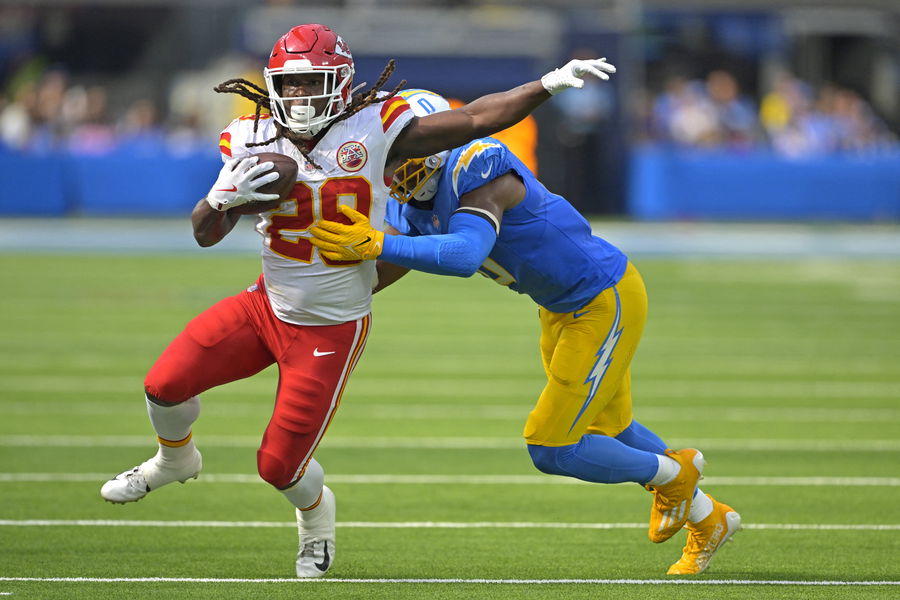 Sep 29, 2024; Inglewood, California, USA; Kansas City Chiefs running back Kareem Hunt (29) runs for a first down before he is forced out of bounds by Los Angeles Chargers linebacker Daiyan Henley (0) in the second half at SoFi Stadium. Mandatory Credit: Jayne Kamin-Oncea-Imagn Images