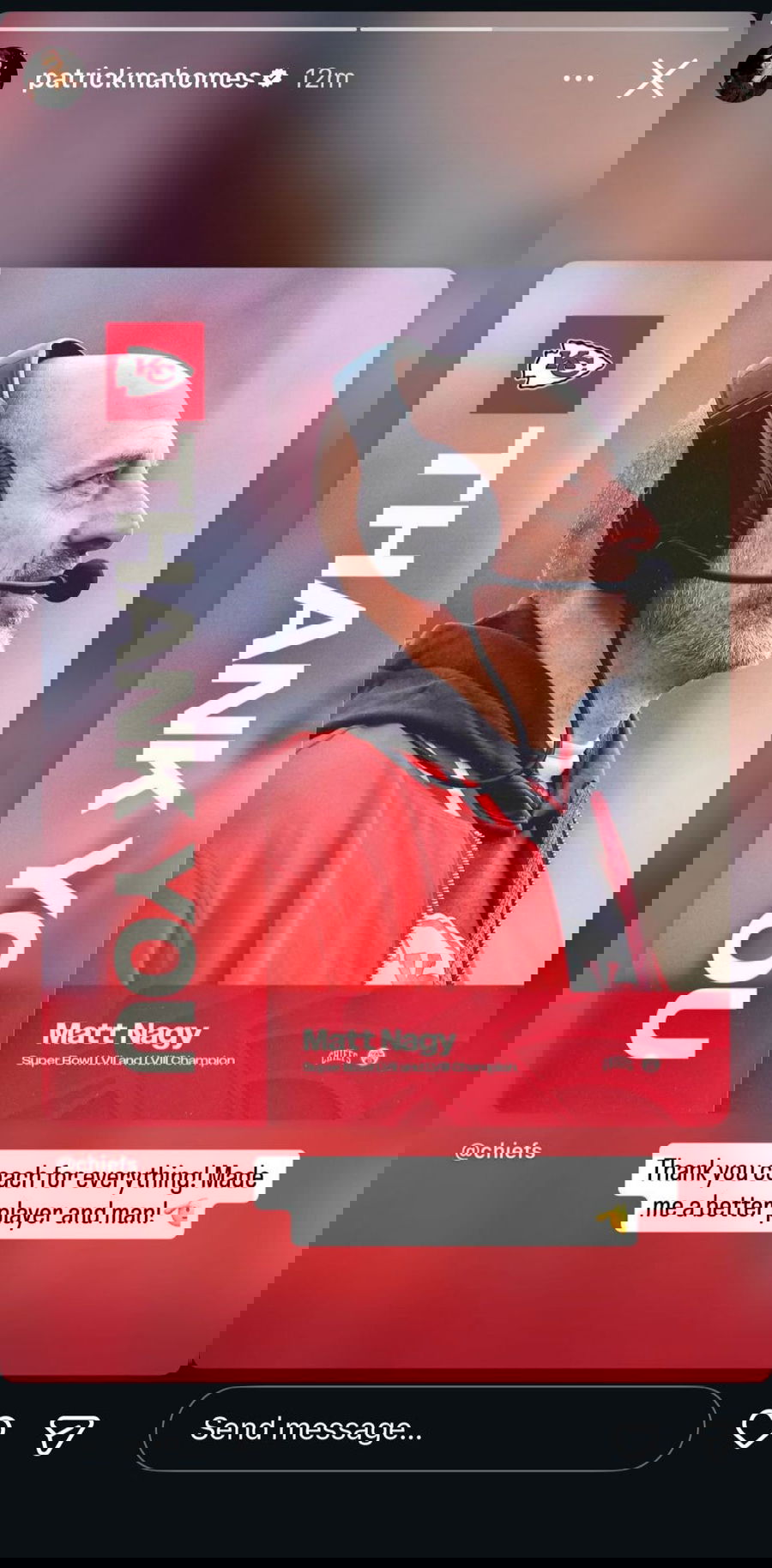 “Thank you coach for everything! Made me a better player and man!” Mahomes wrote in his Instagram story just a few hours after the Chiefs parted ways with Nagy.