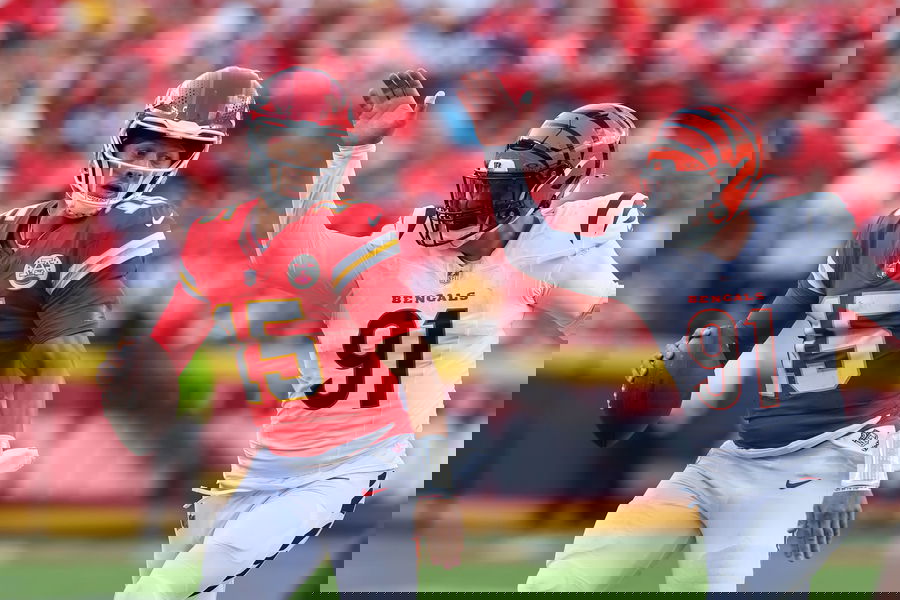 KANSAS CITY, MO – SEPTEMBER 15: Kansas City Chiefs quarterback Patrick Mahomes 15 just escapes the pressure from Cincinnati Bengals defensive end Trey Hendrickson 91 in the third quarter of an NFL, American Football Herren, USA game between the Cincinnati Bengals and Kansas City Chiefs on September 15, 2024 at GEHA Field at Arrowhead Stadium in Kansas City, MO. Photo by Scott Winters/Icon Sportswire NFL: SEP 15 Bengals at Chiefs EDITORIAL USE ONLY Icon2409150894