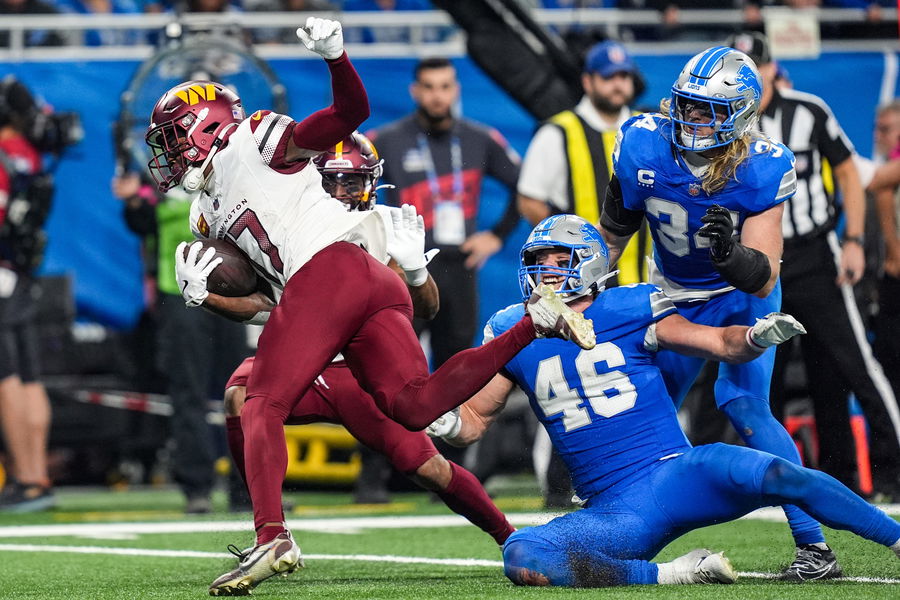 Washington Commanders wide receiver Terry McLaurin (17) is tackled by Detroit Lions linebacker Jack Campbell (46) in the fourth quarter, during the NFL game at Ford Field in Detroit, Mich, Saturday, Jan. 18, 2025.