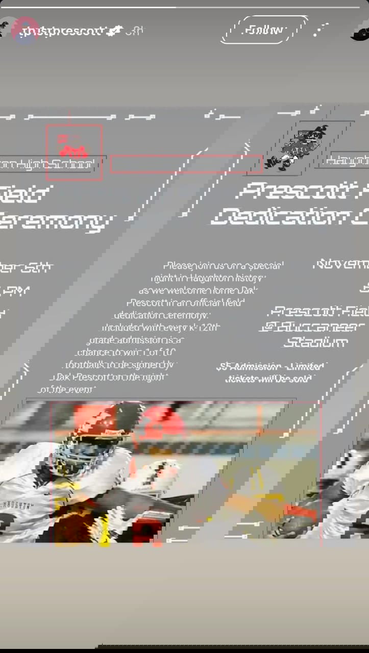 According to an Instagram story from Tad Prescott, Dak is set to return to his hometown for a special honor. Reason? Haughton High School in Louisiana, where the QB graduated, will officially name its football field “Dak Prescott Field.” The ceremony will be at Buccaneer Stadium on November 6th. Prescott is set to attend the event following his matchup against the Arizona Cardinals on November 3.