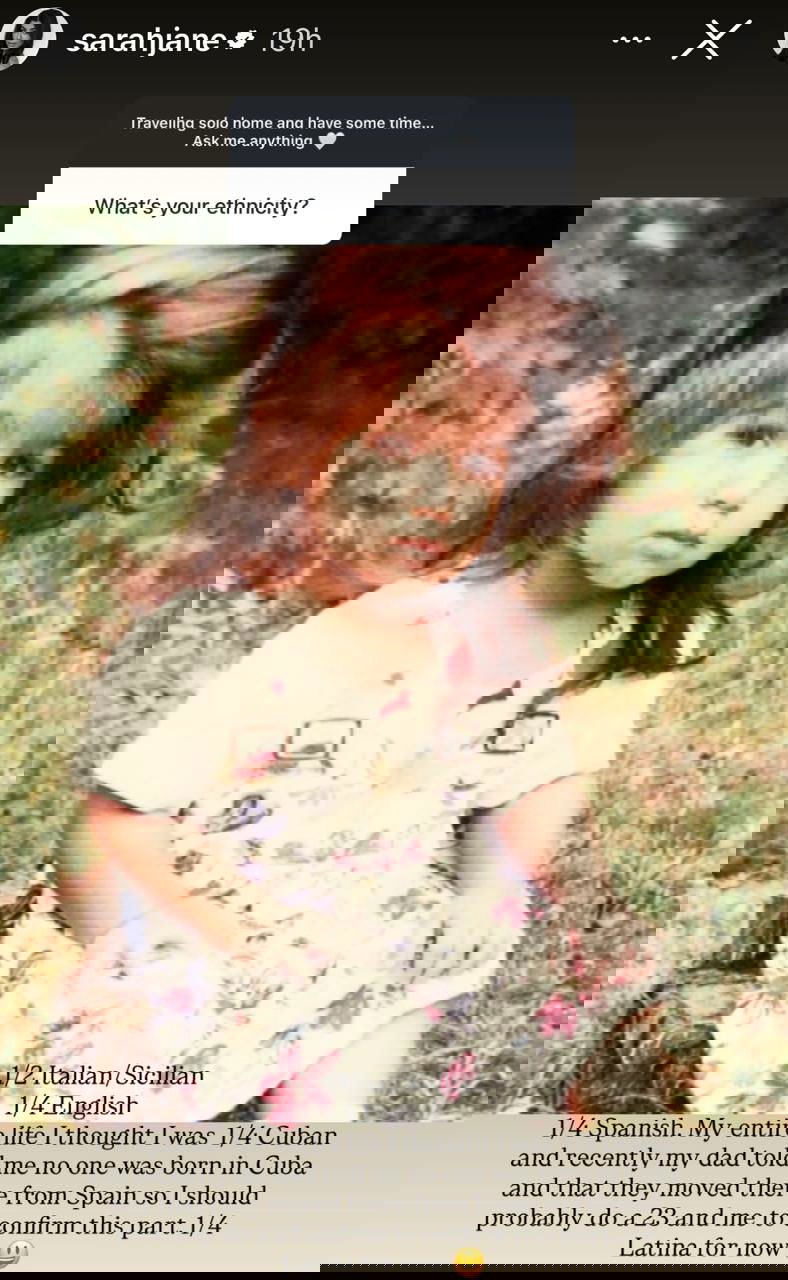 Sarah Jane took to Instagram to announce her diverse ethnicity. Jane posted a story of her childhood photo captioned “1/2 Italian/Sicilian 1/4 English 1/4 Spanish. My entire life I thought I was 1/4 Cuban, and recently my dad told me no one was born in Cuba and that they moved there from Spain. So, I should probably do a 23 and me to confirm this part 1/4 Latina for now.”