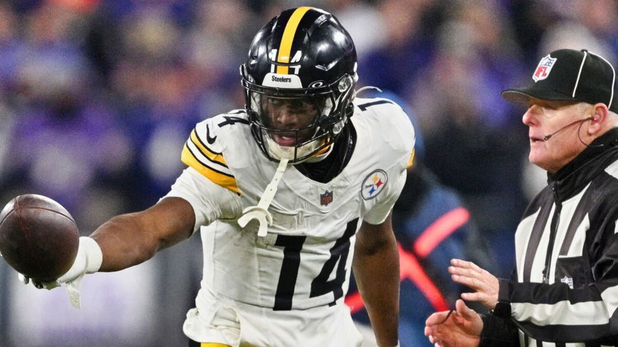 Jan 11, 2025; Baltimore, Maryland, USA; Pittsburgh Steelers wide receiver George Pickens (14) reacts after a catch against the Baltimore Ravens in the fourth quarter in an AFC wild card game at M&T Bank Stadium. Mandatory Credit: Tommy Gilligan-Imagn Images