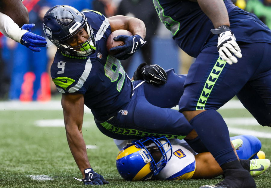 NFL, American Football Herren, USA Los Angeles Rams at Seattle Seahawks Jan 8, 2023 Seattle, Washington, USA Los Angeles Rams linebacker Bobby Wagner 45 tackles Seattle Seahawks running back Kenneth Walker III 9 for a loss during the fourth quarter at Lumen Field. Seattle Lumen Field Washington USA, EDITORIAL USE ONLY PUBLICATIONxINxGERxSUIxAUTxONLY Copyright: xJoexNicholsonx 20230108_jmn_sn8_049