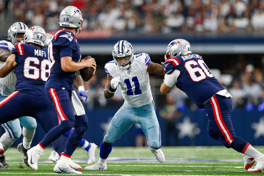 ARLINGTON, TX – OCTOBER 01: Dallas Cowboys linebacker Micah Parsons 11 splits the defense as he pressures New England Patriots quarterback Mac Jones 10 during the game between the New England Patriots and Dallas Cowboys on October 1, 2023 at AT&T Stadium in Arlington, TX. Photo by Andrew Dieb/Icon Sportswire NFL, American Football Herren, USA OCT 01 Patriots at Cowboys EDITORIAL USE ONLY Icon231001665