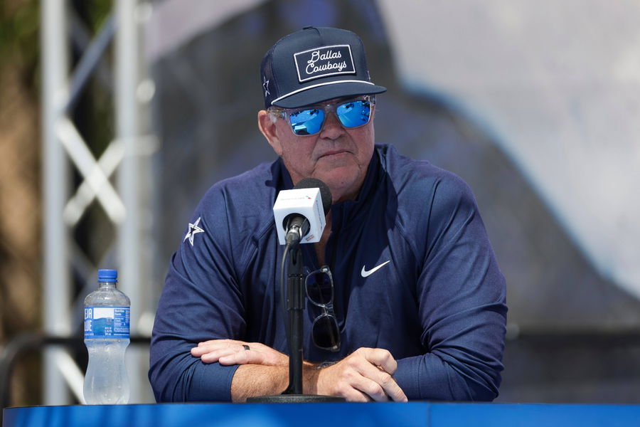 OXNARD, CA – JULY 25: Dallas Cowboys director of player personnel Stephen Jones speaks with reporters during the team s training camp at River Ridge Playing Fields on July 25, 2024 in Oxnard, CA. Photo by Brandon Sloter/Icon Sportswire NFL, American Football Herren, USA JUL 25 Cowboys Training Camp EDITORIAL USE ONLY Icon240725013