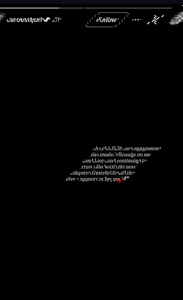“As of 4.15.26, our engagement has ended, ” Estephany wrote in an Instagram story, confirming the news of her split. The influencer and entrepreneur is focused on herself and her son, Lion, at this tough time. She also shared a series of photos with the caption, “hours of silence,” making it clear that she is giving her all to heal. Ramos lauded her spirit with a heartfelt comment.