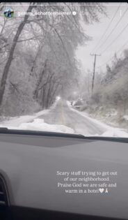 “Scary stuff trying to get out of our neighborhood,” wrote Gemmi Schottenheimer on her recent Instagram story. “Praise God, we are safe and warm in a hotel.”