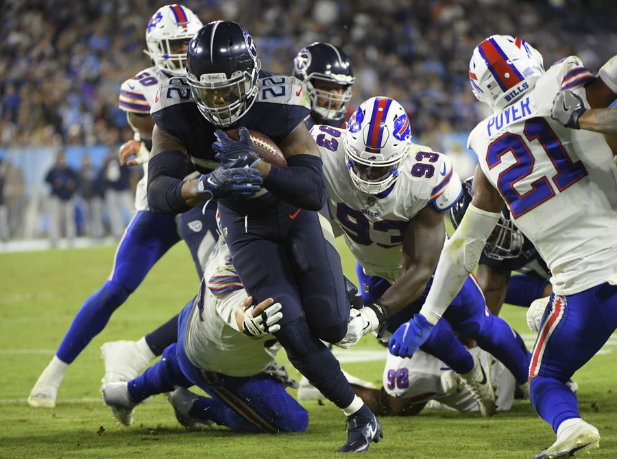 Oct 18, 2021; Nashville, Tennessee, USA; Tennessee Titans running back Derrick Henry (22) breaks tackles as he dives for the end zone against the Buffalo Bills during the second half at Nissan Stadium. Mandatory Credit: Steve Roberts-USA TODAY Sports