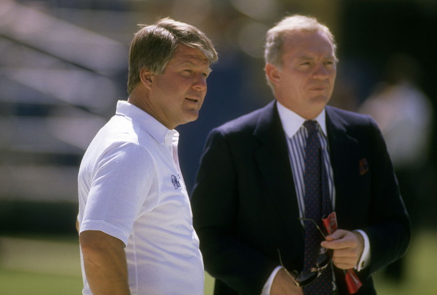 CIRCA 1990 – Dallas Cowboys Owner Jerry Jones (R) and Head Coach Jimmy Johnson (L) in this portrait on the field circa 1990 before an NFL football game. Jones has owned the Cowboys from 1989-present, and Johnson was his head coach from 1989-93. (Photo by Focus on Sport/Getty Images)
