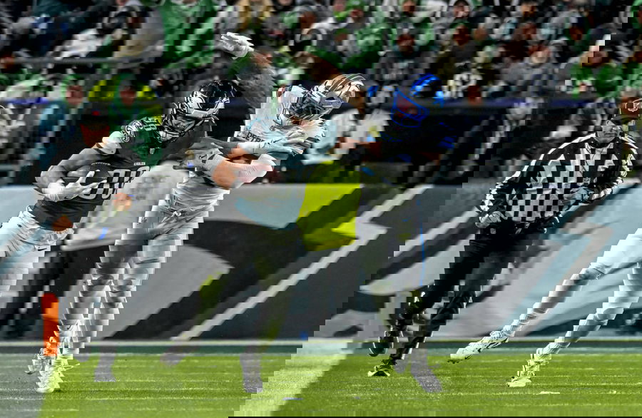 November 16, 2025, Philadelphia, Pa, USA: Philadelphia Eagles tight end Dallas Goedert 88 runs away from Detroit Lions linebacker Derrick Barnes 55 after a catch during the NFL, American Football Herren, USA football matchup between the Detroit Lions and the Philadelphia Eagles at Lincoln Financial Field in Philadelphia, Pennsylvania on November 16, 2025. /Cal Media Philadelphia USA – ZUMAcs17 20251116_faf_cs17_073 Copyright: xScottxSeriox