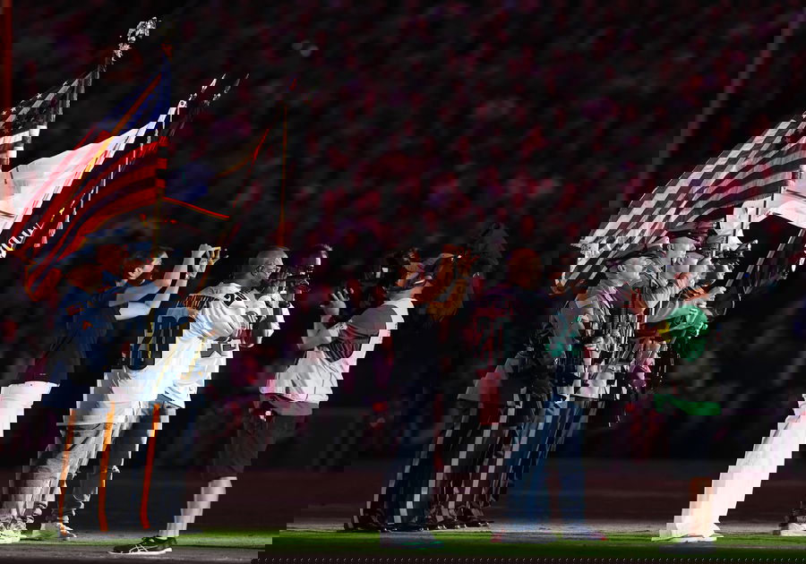 Cowboys QB Dak Prescott relished it while behind him, a row of teammates and staff mirrored the pose, some with hands over their hearts, all united in the ritual. In the foreground, the vast U.S. flag rippled, held steady by a line of individuals on the field, a stark, still symbol of unity contrasting the fractious opinions.