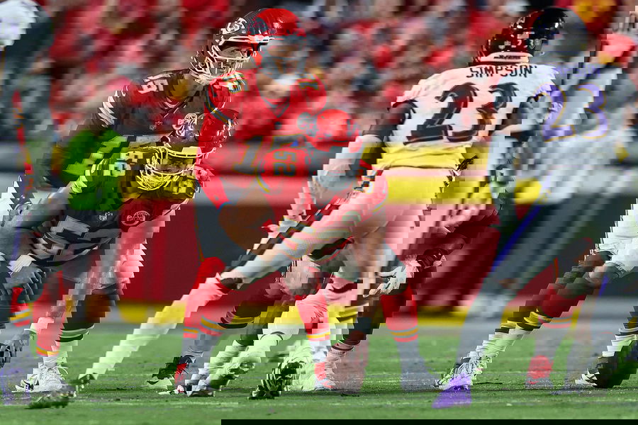 NFL, American Football Herren, USA 2024: Ravens vs Chiefs SEP 5 September 5, 2024: Kansas City Chiefs center Creed Humphrey 52 is ready to snap the ball to Kansas City Chiefs quarterback Patrick Mahomes 15 during a game against the Baltimore Ravens at GEHA Field at Arrowhead Stadium in Kansas City, MO. David Smith/CSM Credit Image: David Smith/Cal Media Kansas City Mo United States of America EDITORIAL USE ONLY Copyright: xx ZUMA-20240905_zma_c04_345.jpg DavidxSmithx csmphotothree290505