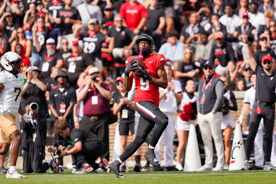 October 11, 2025, Cincinnati, Ohio, USA: Cincinnati Bearcats wide receiver Jeff Caldwell 9 looking towards the endzone for a touchdown after making an uncontested catch during a college football game at Nippert Stadium Cincinnati USA – ZUMAt168 20251011_zsp_t168_008 Copyright: xTrentxPattersonx