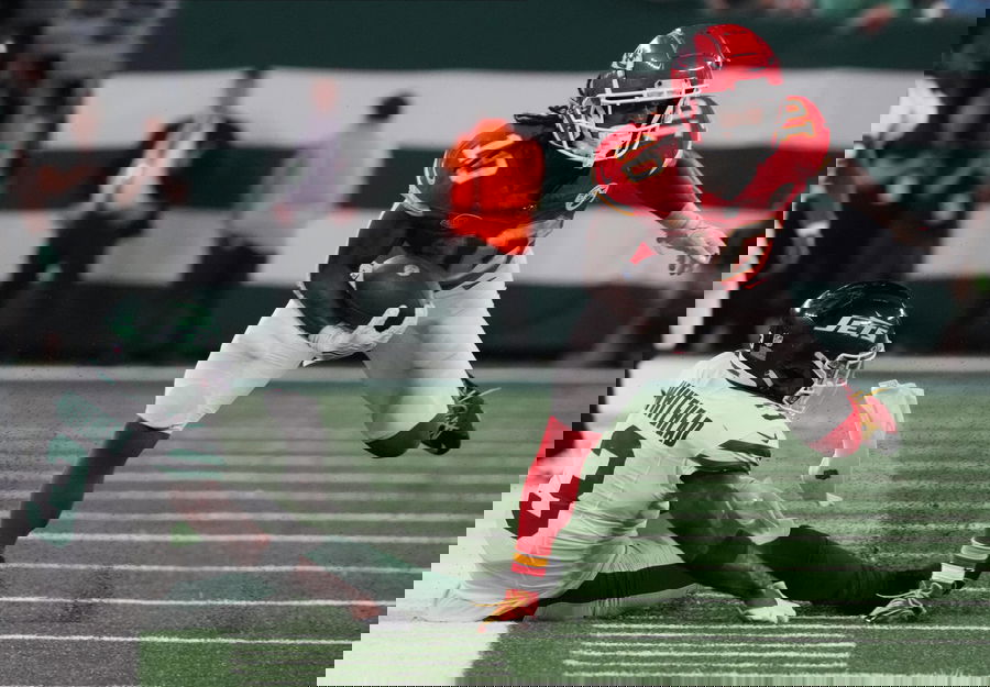 Syndication: The Record East Rutherford, NJ N October 1, 2023 N Jordan Whitehead of the Jets. Isiah Pacheco of the Chiefs in the second half. The New York Jets host the Kansas City Chiefs at MetLife Stadium in East Rutherford, NJ. EDITORIAL USE ONLY PUBLICATIONxINxGERxSUIxAUTxONLY Copyright: xChrisxPedota,xNorthJersey.comx USATSI_21550458