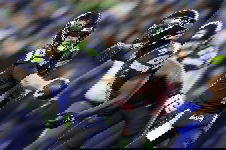 SEATTLE, WA – JANUARY 25: Sam Darnold 14 of the Seattle Seahawks turns to hand off to Kenneth Walker III 9 during the NFC Championship game against the Los Angeles Rams on January 25, 2026 at Lumen Field in Seattle, Washington. Photo by Joe Robbins/Icon Sportswire NFL, American Football Herren, USA JAN 25 NFC Championship Game Rams at Seahawks EDITORIAL USE ONLY Icon573260125035